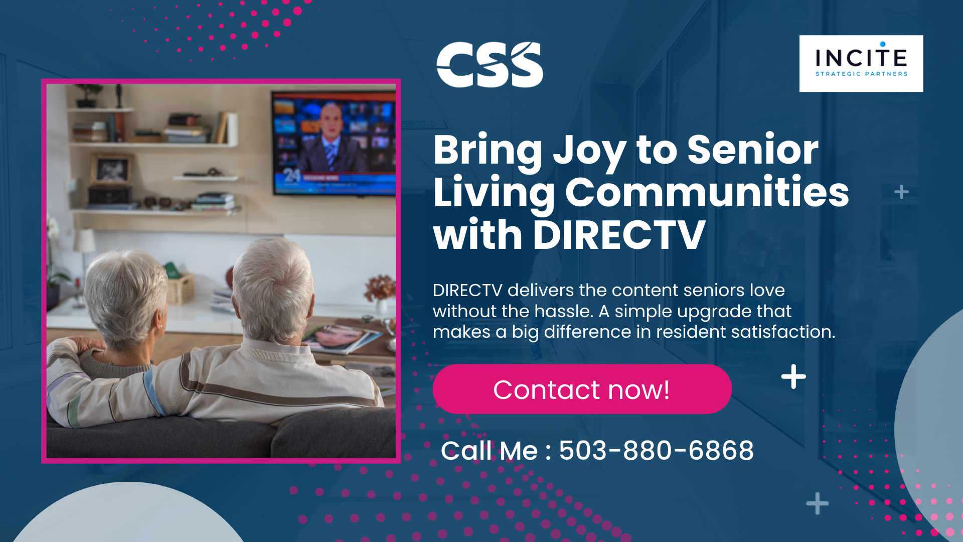 Ready to explore this for your communities? Incite is thrilled to partner with CSS and DIRECTV to bring senior living operators right-sized TV, streaming, and property-wide Wi-Fi solutions – so your residents stay connected and your teams can stay focused on care. Learn more here or contact us for more information.